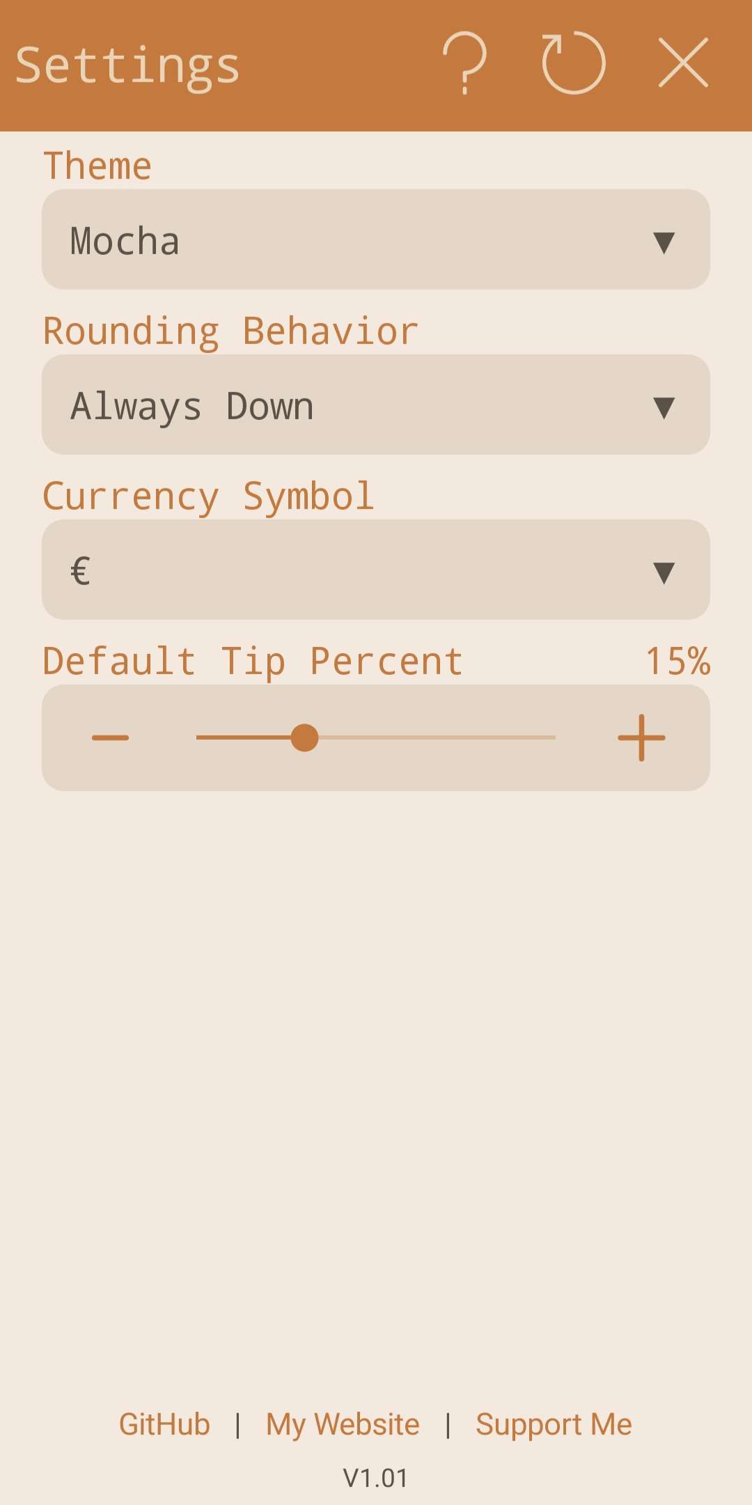 Similar to the previous page, there also exists buttons on the top title bar for navigation. The button that looks like a ? opens this help page. The button that looks like a arrow pointing to itself is a button to reset all settings to their defaults. Lastly, the X button closes the settings menu and takes you back to the main calculator.