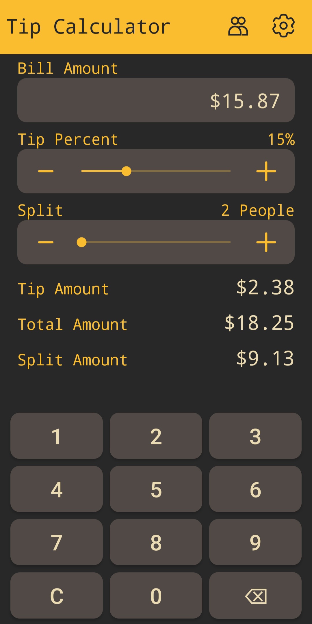 From the home page, there exists two buttons on the top title bar. The one that looks like a little person toggles the "Splitting" menu where you can split the bill among multiple people. The gear icon opens the settings menu where you can adjust various settings of the app.